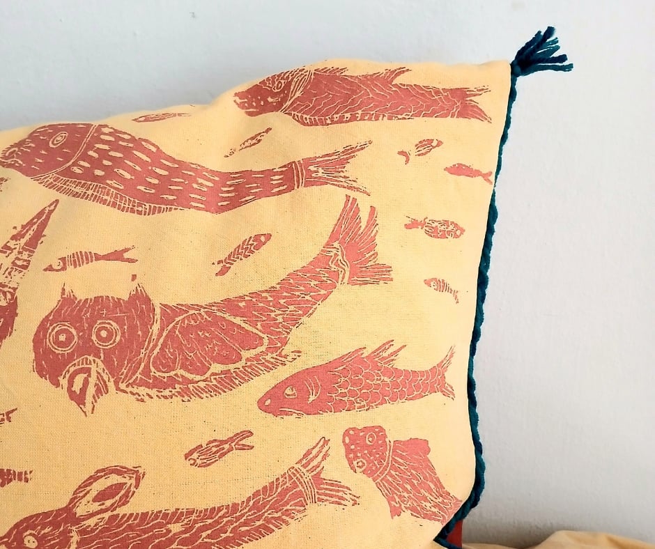 Pillowcases with our favorite Persian Sea Creatures designed and handprinted by Loupes. With handmade webbing by Magda. Size, 40x60 cm. Ideal for a 50x70 cm pillow. Available in two colors (rose and green).
